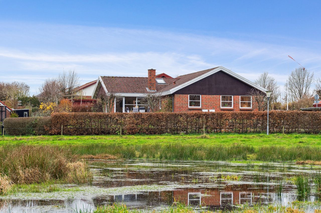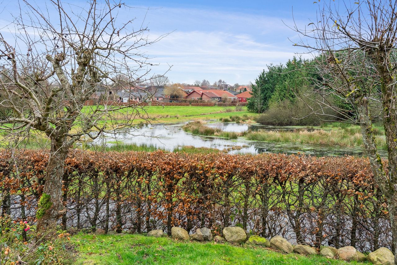 Fra den spændende og solrige have med terrasse og hyggelige kroge og en fantastisk udsigt til eng, sø og lille skov. Her er et rigt dyreliv med både fugle, frøer og pindsvin, som bidrager til den særlige atmosfære.